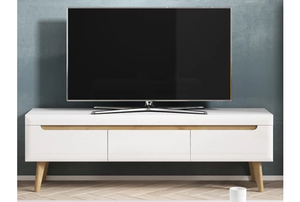 Široká TV skrinka so šírkou 160 cm z kolekcie Nordi – inšpirujte sa útulným severským štýlom. Moderný nábytok v kombinácii dub/biela lesk dopĺňajú masívne drevené nožičky.