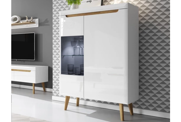 Nízka vitrína z kolekcie Nordi – inšpirujte sa útulným severským štýlom. Moderný nábytok so zaoblenými hranami dopĺňajú masívne drevené nožičky, ktoré dodávajú interiéru ľahkosť a svieži vzhľad. Leskle biele plochy podkresľujú čelné línie v dubovom drevodekóre, vďaka ktorým nábytok skvele vynikne.