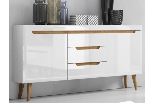 Široká komoda z kolekcie Nordi – inšpirujte sa útulným severským štýlom. Moderný nábytok so zaoblenými hranami dopĺňajú masívne drevené nožičky, ktoré dodávajú interiéru ľahkosť a svieži vzhľad. Leskle biele plochy podkresľujú čelné línie v dubovom drevodekóre, vďaka ktorým nábytok skvele vynikne.