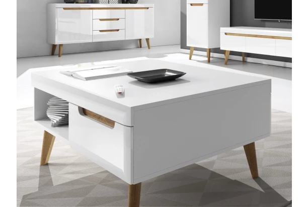 Konferenčný stolík so zásuvkami z kolekcie Nordi – inšpirujte sa útulným severským štýlom. Moderný nábytok so zaoblenými hranami dopĺňajú masívne drevené nožičky, ktoré dodávajú interiéru ľahkosť a svieži vzhľad. Leskle biele plochy podkresľujú čelné línie v dubovom drevodekóre, vďaka ktorým nábytok skvele vynikne.