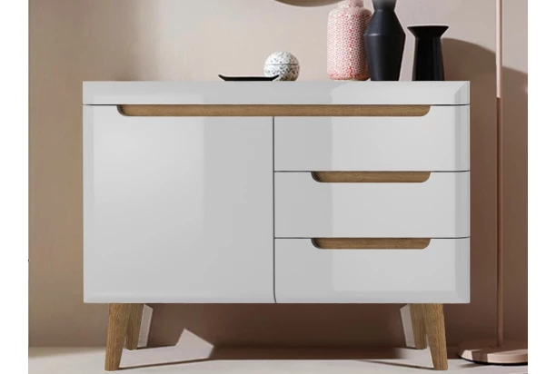 Komoda so šuplíkmi z kolekcie Nordi – inšpirujte sa útulným severským štýlom. Moderný nábytok so zaoblenými hranami dopĺňajú masívne drevené nožičky, ktoré dodávajú interiéru ľahkosť a svieži vzhľad. Lesklé biele plochy podkresľujú čelné línie v dubovom drevodekore, vďaka ktorým nábytok skvele vynikne.