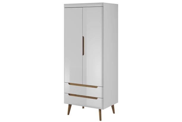 Šatníková skriňa z kolekcie Nordi – inšpirujte sa útulným severským štýlom. Moderný nábytok so zaoblenými hranami dopĺňajú masívne drevené nožičky, ktoré dodávajú interiéru ľahkosť a svieži vzhľad. Leskle biele plochy podkresľujú čelné línie v dubovom drevodekore, vďaka ktorým nábytok skvele vynikne