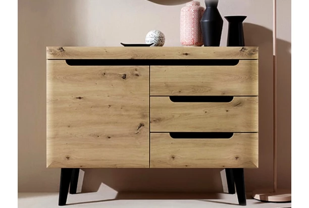 Komoda so zásuvkami z kolekcie Nord – inšpirujte sa útulným severským štýlom. Moderný nábytok so zaoblenými hranami dopĺňajú masívne drevené nôžky, ktoré dodávajú interiéru ľahkosť a svieži vzhľad. Teplé tóny drevodekoru podkresľujú tmavé čelné línie, vďaka ktorým nábytok skvelo vynikne.