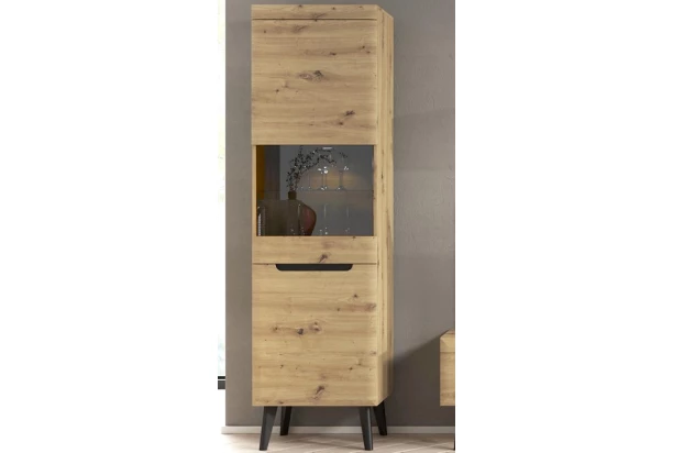 Vysoká vitrína z kolekcie Nord – inšpirujte sa útulným severským štýlom. Moderný nábytok so zaoblenými hranami dopĺňajú masívne drevené nôžky, ktoré dodávajú interiéru ľahkosť a svieži vzhľad. Teplé tóny drevodekoru podkresľujú tmavé čelné línie, vďaka ktorým nábytok vynikne.