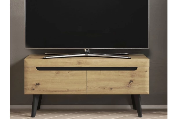 Televízne skrinka so šírkou 107 cm z kolekcie Nord – inšpirujte sa útulným severským štýlom. Moderný nábytok so zaoblenými hranami, dopĺňajú masívne drevené nôžičky, ktoré dodávajú interiéru ľahkosť a svieži vzhľad. Teplé tóny drevodekoru podkresľujú tmavé čelné línie, vďaka ktorým nábytok skvelo vynikne.