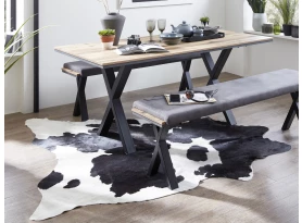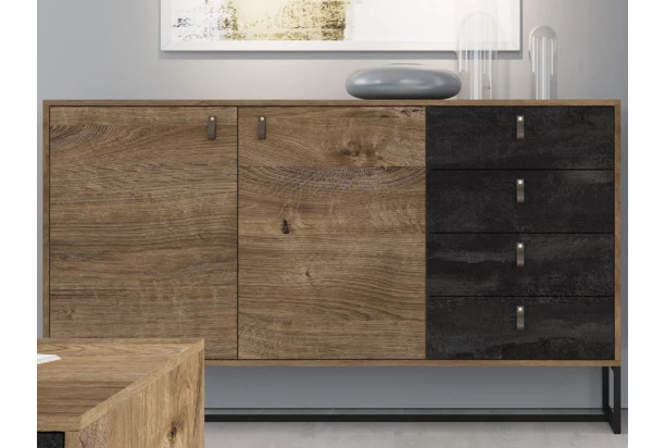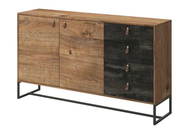 Široká komoda z kolekcie Dark – dodajte Vášmu bytu nádych extravagancie s nábytkom v industriálnom štýle. Povrchy v príjemnom dubovom drevodekore a imitácii čierneho lávového kameňa ,doplňuje kovová podnož a originálne úchyty z pravej kože.