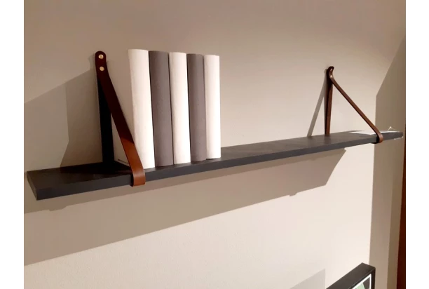 Nástenná polica z kolekcie Dark – dodajte Vášmu bytu nádych extravagancie s nábytkom v industriálnom štýle. Povrchy v imitácii čierneho lávového kameňa dopĺňa originálne zavesenie z pravej kože.
