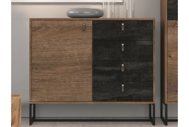 Skrinka so zásuvkami z kolekcie Dark – dodajte Vášmu bytu nádych extravagancie s nábytkom v industriálnom štýle. Povrchy v príjemnom dubovom drevodekore a imitácii čierneho lávového kameňa doplňuje kovová podnož a originálne úchyty z pravej kože.