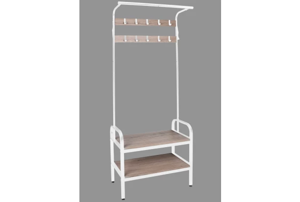 Praktický predsieňový stojací vešiak s bielou kovovou konštrukciou, závesnými háčikmi a odkladacími poličkami. Môže byť umiestnený nielen do predsiene, ale aj do kúpeľne alebo napríklad spálne.