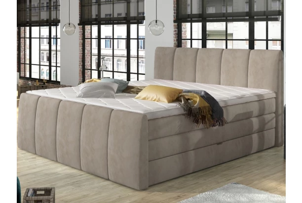 Vyskúšajte skutočné pohodlie postele typu boxspring. Očalúnenie látkou v béžovom odtieni. Je vybavená dvojitou vrstvou vysokých matracov pre príjemne mäkkučké a komfortné spanie. Navyše oceníte aj praktické úložné priestory, ktoré sú prístupné z bočných strán. Vysoká zaoblená čela s prešitím dopĺňajú elegantný dizajn postele.