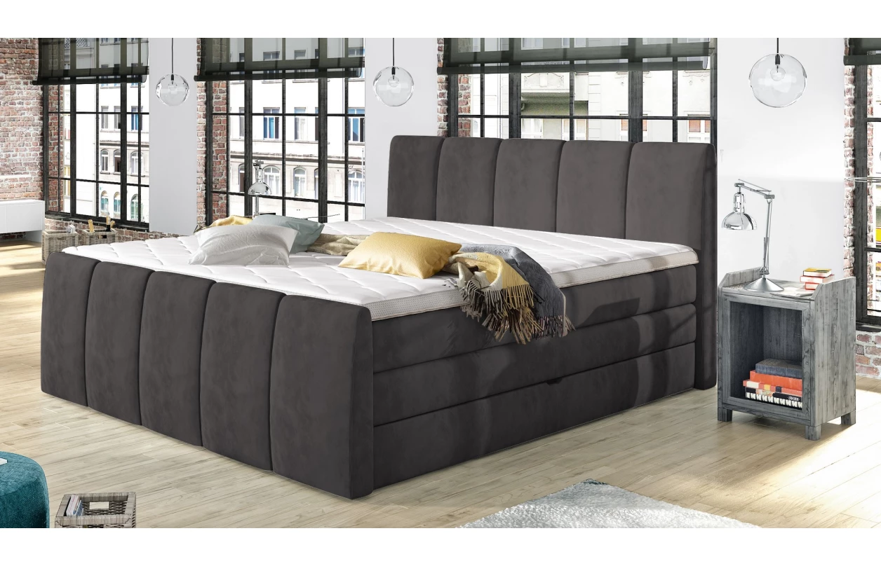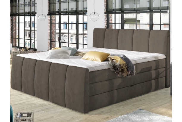 Vyskúšajte skutočné pohodlie postele typu boxspring. Očalúnenie látkou vo svetlo hnedom odtieni. Lôžko je vybavené dvojitou vrstvou vysokých matracov pre príjemne mäkkučké a komfortné spanie. Navyše oceníte aj praktické úložné priestory, ktoré sú prístupné z bočných strán. Vysoké zaoblené čelá s prešitím dopĺňajú elegantný dizajn postele.