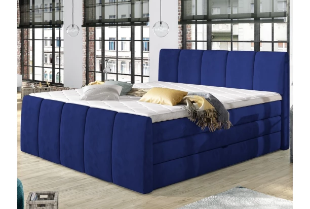 Vyskúšajte skutočné pohodlie postele typu boxspring. Očalúnená látkou v modrom odtieni. Lôžko je vybavené dvojitou vrstvou vysokých matracov, pre príjemne mäkkučké a komfortné spanie. Navyše oceníte aj praktické úložné priestory, ktoré sú prístupné z bočných strán. Vysoké zaoblené čelá s prešitím dopĺňajú elegantný dizajn postele.