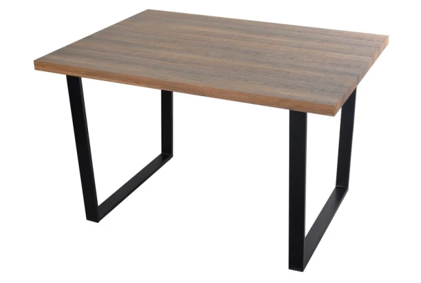 Obdĺžnikový jedálenský stôl o rozmere 120×90 cm je ladený do industriálneho štýlu. Čierna kovová podnož a mohutná jedálenská doska v dubovom dekore pôsobí masívne.