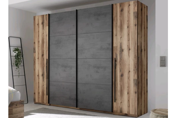 Užite si nevšednú atmosféru domova s nábytkom, ktorý zaujme už na pohľad – šatníková skriňa z kolekcie Sarnia so šírkou 312 cm v imitácii tmavého šedého betónu a alpských zrubových dosiek je inšpirovaná atraktívnym industriálnym dizajnom. Spojenie tradičnej optiky dreva s netradičným betónom, pôsobí moderne a pritom veľmi útulne.