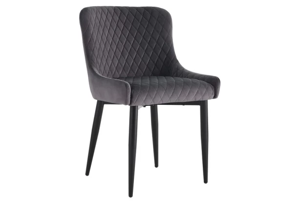 Elegantný zaoblený dizajn jedálenskj stoličky podtrhuje okrasný prešiv zamatovej tmavošedej látky – stolička tak vnesie do každej jedálne noblesnú atmosféru a pohodlie zároveň.