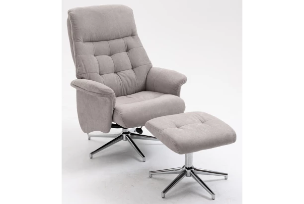Relaxačné TV kreslo s podnožkou poskytuje príjemné sedenie pri televízii, pri čítaní alebo len tak počas odpočinku. Očalúnené látkou vo farbe svetlo šedá a vybavené funkciou polohovania operadla.