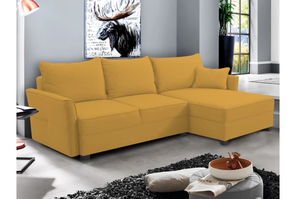Elegantná rohová sedacia súprava si Vás získa pre komfortne mäkké sedenie aj praktickosť. Sedačka je očalúnená látkou vo farbe horčicovo žltá, ktorá je príjemne hebká na dotyk a zároveň odolná voči oderu a rozliatiu kvapalín. Súčasťou sedačky je rozkladacia funkcia na lôžko, praktický úložný priestor aj bočné látkové vrecká na odkladanie novín alebo napríklad časopisov. Táto rohová sedačka má ideálne rozmery aj pre menšiu obývačku. A navyše vďaka univerzálnej montáži otomanu na obe strany môže tvoriť pravý alebo ľavý roh – sedačka tak bude dobre pasovať takmer do každého interiéru.