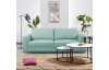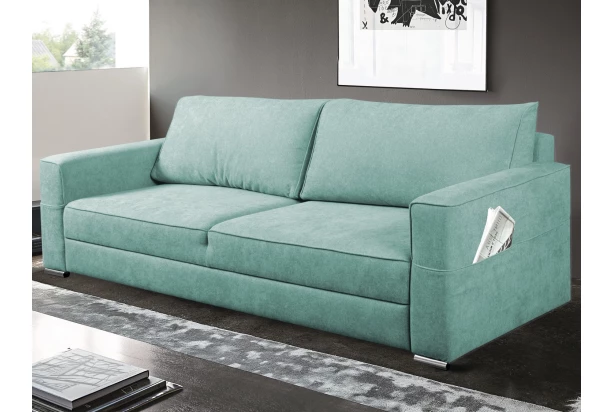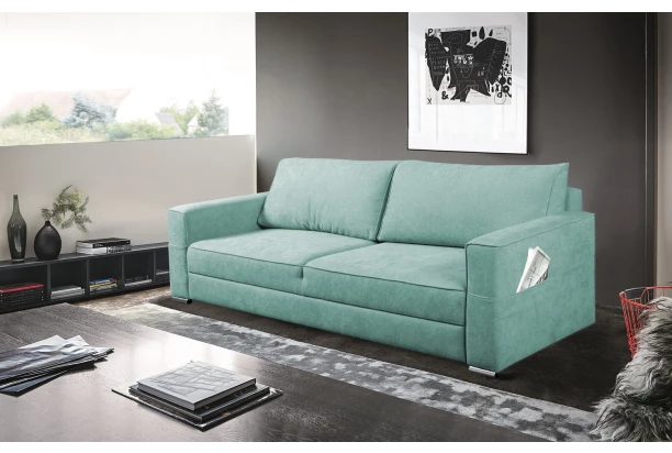 Široká trendová pohovka je priestranná, pohodlná a zároveň praktická. Očalúnená látkou v mentolovom modro-zelenom odtieni. S rozkladaciou funkcióu na lôžko, úložným priestorom a zaujímavo riešenými bočnými opierkami, ktoré navyše ukrývajú nenápadné vrecká, kam ľahko uschováte noviny alebo časopisy.