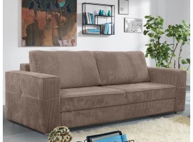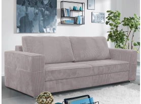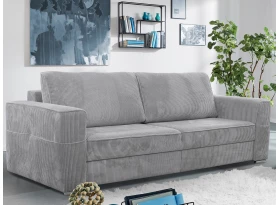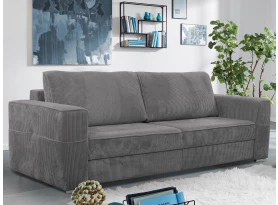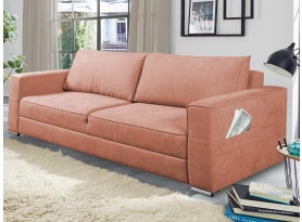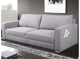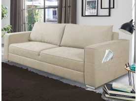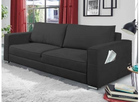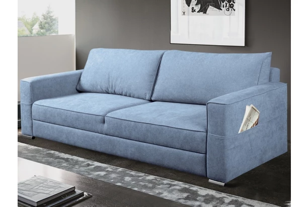 Široká trendová pohovka je priestranná, pohodlná a zároveň praktická. Očalúnená látkou v modrom odtieni. Ponúka rozkladaciu funkciu na príležitostné lôžko, úložný priestor pod sedadlom a zaujímavo riešené bočné opierky rúk, ktoré navyše ukrývajú nenápadné vrecká, kam ľahko uschováte noviny alebo časopisy.