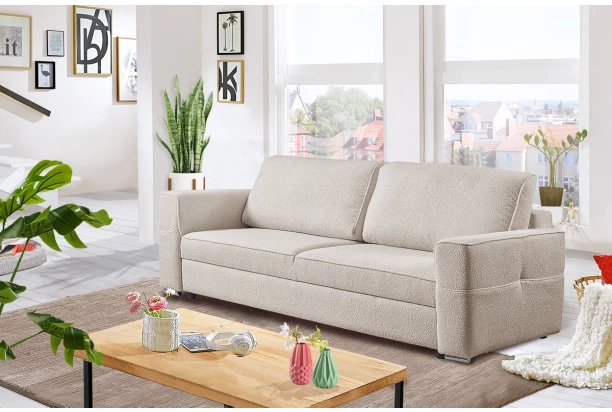 Očalúnená mäkkučkou kučeravou látkou vo farbe krémová, ktorá zaujme a zútulní váš domov. S rozkladacou funkciou na lôžko, úložným priestorom a zaujímavo riešenými bočnými podrúčkami, ktoré navyše ukrývajú nenápadné vrecká, kam ľahko uschováte noviny alebo časopisy.