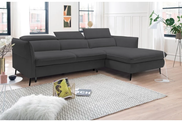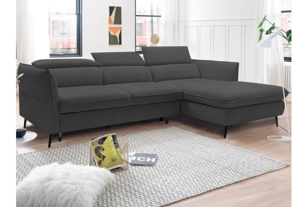 Rohová sedacia súprava v trendovom elegantnom dizajne, pripomína optiku vankúšov. Komfortné sedenie dopĺňajú polohovateľné chrbtové opierky a nastaviteľné bočné podrúčky, vďaka ktorým si prispôsobíte pohodlie podľa aktuálnej potreby. Sedačka s pravým otomanom je očalúnená zamatovo mäkkou látkou v tmavo šedom odtieni. Praktickou stránkou je rozkladacia funkcia na lôžko a úložný priestor, ktorý sa vždy hodí.