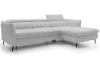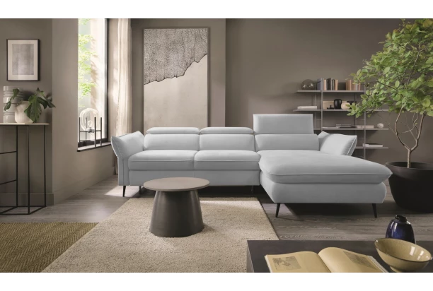 Rohová sedacia súprava v trendovom elegantnom dizajne pripomína optiku vankúšov. Komfortné sedenie dopĺňajú polohovateľné chrbtové opierky a nastaviteľné bočné podrúčky, vďaka ktorým si prispôsobíte pohodlie podľa aktuálnej potreby. Sedačka tvoriaca pravý roh je očalúnená zamatovo lesklú mäkkou látkou v odtieni svetlo šedá. Praktickou stránkou je rozkladacia funkcia na lôžko a úložný priestor, ktorý sa vždy hodí.
