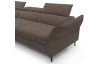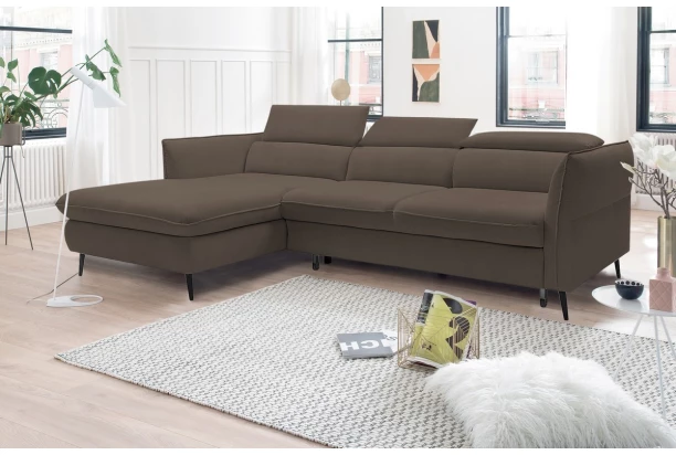 Rohová sedacia súprava v trendovom elegantnom dizajne pripomína optiku vankúšov. Komfortné sedenie dopĺňajú polohovateľné chrbtové opierky a nastaviteľné bočné podrúčky, vďaka ktorým si prispôsobíte pohodlie podľa aktuálnej potreby. Sedačka tvoriaca ľavý roh je očalúnená zamatovo mäkkou látkou v odtieni hnedá. Praktickou stránkou je rozkladacia funkcia na lôžko a úložný priestor, ktorý sa vždy hodí.