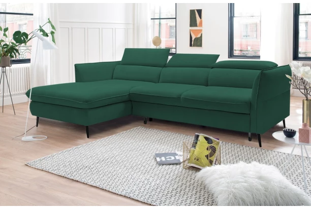 Rohová sedacia súprava v trendovom elegantnom dizajne pripomína optiku vankúšov. Komfortné sedenie dopĺňajú polohovateľné chrbtové opierky a nastaviteľné bočné podrúčky, vďaka ktorým si prispôsobíte pohodlie podľa aktuálnej potreby. Sedačka tvoriaca ľavý roh je očalúnená zamatovo lesklú mäkkou látkou v odtieni zelená. Praktickou stránkou je rozkladacia funkcia na lôžko a úložný priestor, ktorý sa vždy hodí.
