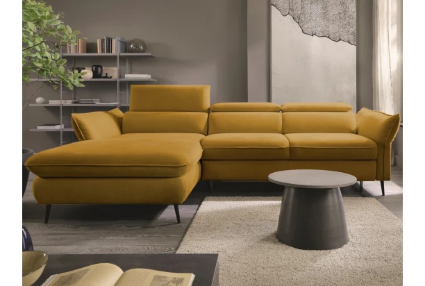 Rohová sedacia súprava v trendovom elegantnom dizajne pripomína optiku vankúšov. Komfortné sedenie dopĺňajú polohovateľné chrbtové opierky a nastaviteľné bočné podrúčky, vďaka ktorým si prispôsobíte pohodlie podľa aktuálnej potreby. Sedačka tvoriaca ľavý roh je očalúnená zamatovo mäkkou látkou v odtieni horčicová žltá. Praktickou stránkou je rozkladacia funkcia na lôžko a úložný priestor, ktorý sa vždy hodí.