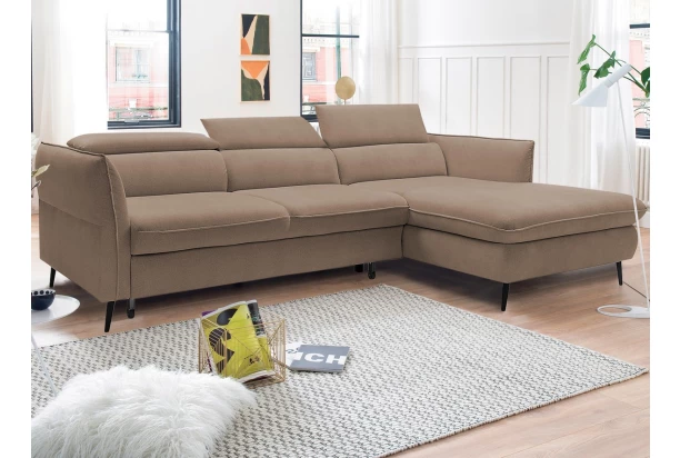 Rohová sedacia súprava v trendovom elegantnom dizajne pripomína optiku vankúšov. Komfortné sedenie dopĺňajú polohovateľné chrbtové opierky a nastaviteľné bočné podrúčky, vďaka ktorým si prispôsobíte pohodlie podľa aktuálnej potreby. Sedačka tvoriaca pravý roh je očalúnená zamatovo mäkkou látkou v odtieni svetlo hnedá. Praktickou stránkou je rozkladacia funkcia na lôžko a úložný priestor, ktorý sa vždy hodí.