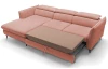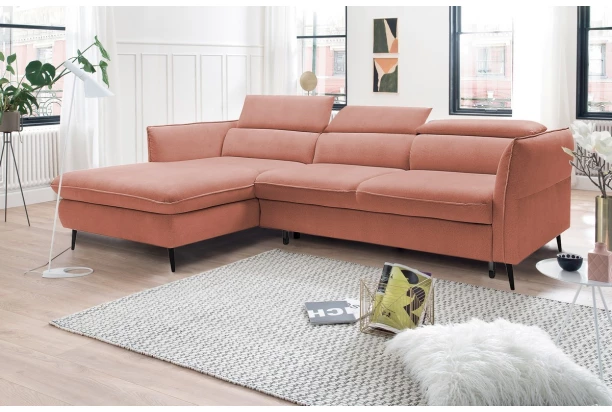 Rohová sedacia súprava v trendovom elegantnom dizajne pripomína optiku vankúšov. Komfortné sedenie dopĺňajú polohovateľné chrbtové opierky a nastaviteľné bočné podrúčky, vďaka ktorým si prispôsobíte pohodlie podľa aktuálnej potreby. Sedačka tvoriaca ľavý roh je očalúnená zamatovo lesklú mäkkou látkou v odtieni lososová. Praktickou stránkou je rozkladacia funkcia na lôžko a úložný priestor, ktorý sa vždy hodí.