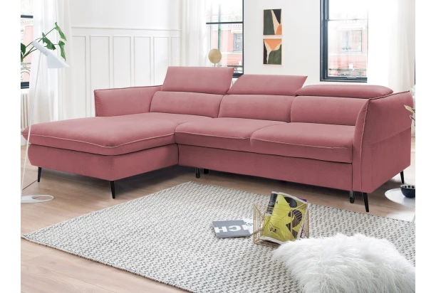 Rohová sedacia súprava v trendovom elegantnom dizajne pripomína optiku vankúšov. Komfortné sedenie dopĺňajú polohovateľné chrbtové opierky a nastaviteľné bočné podrúčky, vďaka ktorým si prispôsobíte pohodlie podľa aktuálnej potreby. Sedačka tvoriaca ľavý roh je očalúnená zamatovo lesklú mäkkou látkou v odtieni staroružová. Praktickou stránkou je rozkladacia funkcia na lôžko a úložný priestor, ktorý sa vždy hodí.