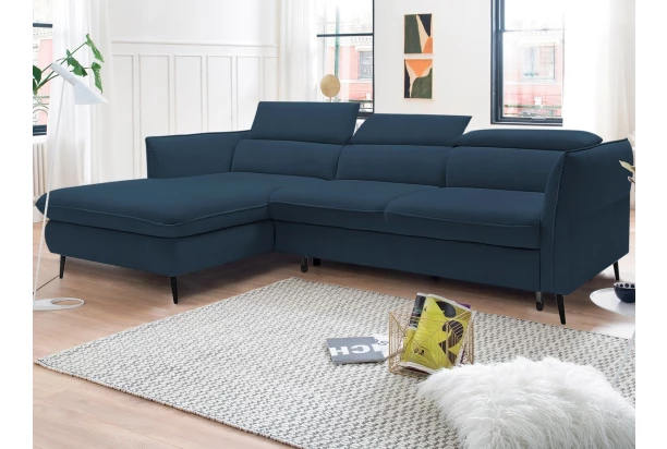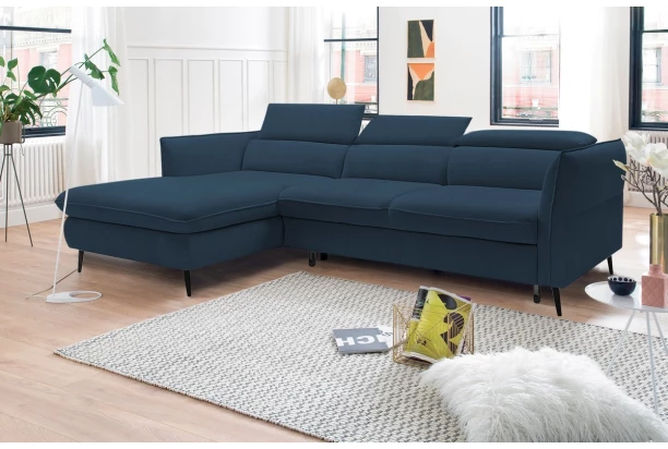 Rohová sedacia súprava v trendovom elegantnom dizajne ,pripomína optiku vankúšov. Komfortné sedenie dopĺňajú polohovateľné chrbtové opierky a nastaviteľné bočné podrúčky, vďaka ktorým si prispôsobíte pohodlie podľa aktuálnej potreby. Sedačka tvoriaca ľavý roh je očalúnená zamatovo lesklú mäkkou látkou v odtieni námornícka modrá. Praktickou stránkou je rozkladacia funkcia na lôžko a úložný priestor, ktorý sa vždy hodí.