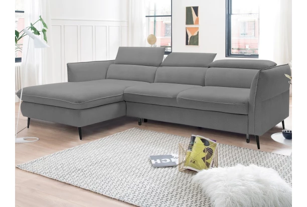 Rohová sedacia súprava v trendovom elegantnom dizajne, pripomína optiku vankúšov. Komfortné sedenie dopĺňajú polohovateľné chrbtové opierky a nastaviteľné bočné podrúčky, vďaka ktorým si prispôsobíte pohodlie podľa aktuálnej potreby. Sedačka tvoriaca ľavý roh je očalúnená zamatovo mäkkou látkou v odtieni stredne šedá. Praktickou stránkou je rozkladacia funkcia na lôžko a úložný priestor, ktorý sa vždy hodí.