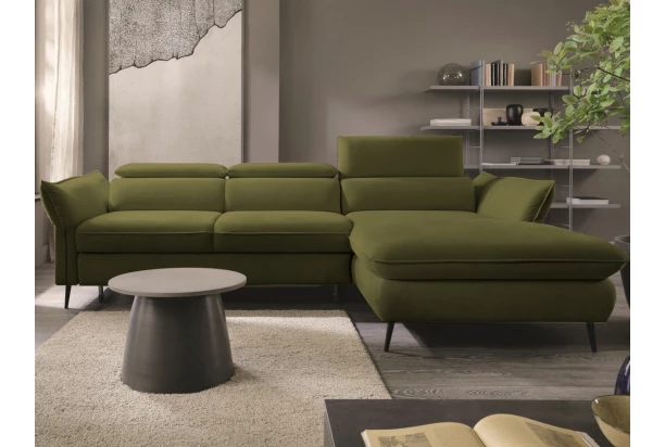 Rohová sedacia súprava v trendovom elegantnom dizajne pripomína optiku vankúšov. Komfortné sedenie dopĺňajú polohovateľné chrbtové opierky a nastaviteľné bočné podrúčky, vďaka ktorým si prispôsobíte pohodlie podľa aktuálnej potreby. Sedačka tvoriaca pravý roh je očalúnená zamatovo lesklú mäkkou látkou v odtieni machová zelená. Praktickou stránkou je rozkladacia funkcia na lôžko a úložný priestor, ktorý sa vždy hodí.