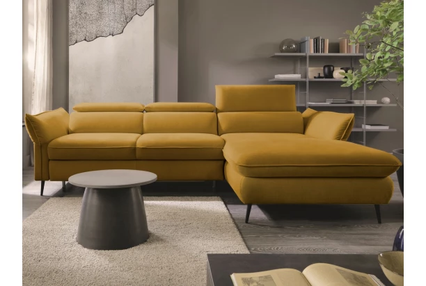 Rohová sedacia súprava v trendovom elegantnom dizajne pripomína optiku vankúšov. Komfortné sedenie dopĺňajú polohovateľné chrbtové opierky a nastaviteľné bočné podrúčky, vďaka ktorým si prispôsobíte pohodlie podľa aktuálnej potreby. Sedačka tvoriaca pravý roh je očalúnená zamatovo lesklú mäkkou látkou v odtieni horčicová žltá. Praktickou stránkou je rozkladacia funkcia na lôžko a úložný priestor, ktorý sa vždy hodí.
