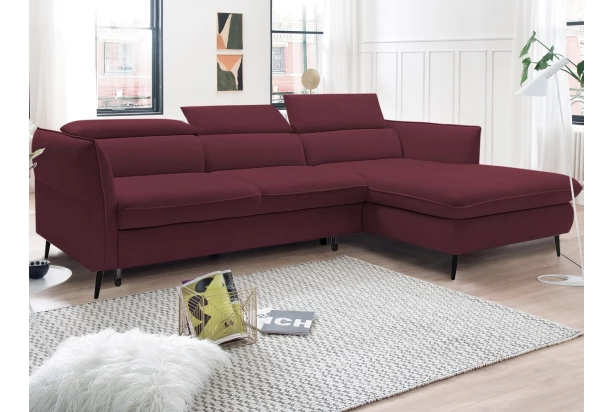 Rohová sedacia súprava v trendovom elegantnom dizajne pripomína optiku vankúšov. Komfortné sedenie dopĺňajú polohovateľné chrbtové opierky a nastaviteľné bočné podrúčky, vďaka ktorým si prispôsobíte pohodlie podľa aktuálnej potreby. Sedačka tvoriaca pravý roh je očalúnená zamatovo lesklú mäkkou látkou v odtieni vínová. Praktickou stránkou je rozkladacia funkcia na lôžko a úložný priestor, ktorý sa vždy hodí.