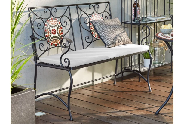 Kovová záhradná lavica s motívom červenej mosaiky, nájde svoje miesto nielen na vonkajšej záhrade a balkóne, ale aj v interiéri. Vrátane sedacieho vankúša na mäkké posedenie.