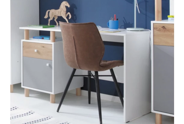 Písací stôl z kolekcie Faro v trendovom severskom štýle, zaujme na pohľad. Masívne nohy dopĺňa kombinácia duba s bielymi a šedými plochami. Nábytok je vhodný pre vybavenie izby ,všetkých vekových kategórií – pre deti, teenagerov i dospelých.