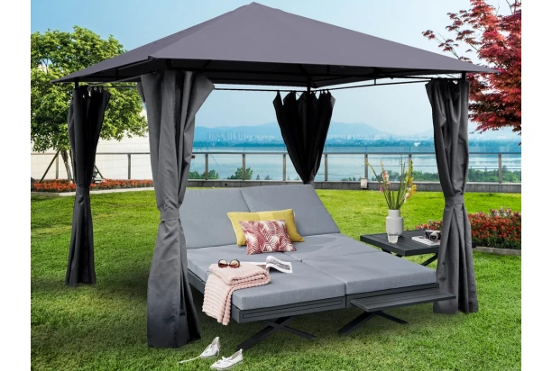 Priestranný záhradný altánok s rozmerom 300×300 cm je vybavený praktickými bočnými závesmi, ktoré Vás ochránia pred slnečnými lúčmi počas horúcich letných dní.