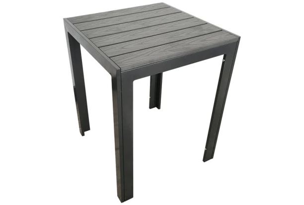 Štvorcový záhradný stôl z antracitového kovu a umelej imitácie šedého dreva má pevnú konštrukciu a je praktický pre jeho ľahkú údržbu vo vonkajšom prostredí. Vďaka rozmeru jedálenský plochy 60×60 cm je ideálna aj do veľmi malého priestoru.