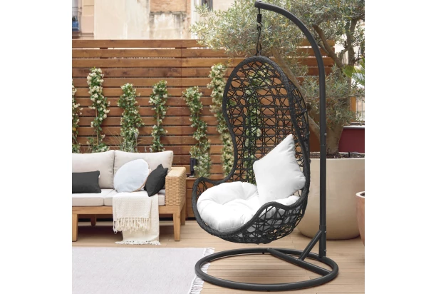 Závesné hojdacie kreslo pre chvíle pohody pri príjemnom hojdaní. Zaguľatený sedák z čierneho umelého ratanu dopĺňa sedací a oporný vankúš. Skvele doplnia nielen vonkajšiu záhradu, ale napríklad aj interiér.