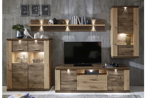 Ak chcete kvalitný a zároveň moderný dizajnový nábytok, potom je obývacia stena Grande práve pre Vás. V kombinácii útulných dekorácii dub artisan a dub Ribbeck. Horné rámy obsahujú bodové LED svetlá, ktoré na štruktúrovanom povrchu nábytku hrajú hru svetla a tieňov a vytvárajú tak naozaj exkluzívny efekt. Nábytok zároveň zostava účelný a praktický.