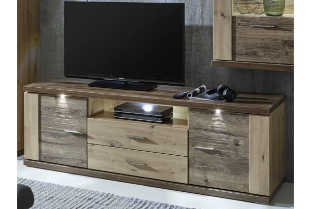 Široká TV skrinka z kolekcie Grande – ak chcete kvalitný a zároveň moderný dizajnový nábytok, potom je tento model práve pre vás. V kombinácii útulných dekorov dub artisan a dub ribbeck. Horný rám obsahuje bodové LED svetlá, ktoré na štruktúrovanom povrchu nábytku hrajú hru svetla a tieňov a vytvárajú tak naozaj exkluzívny efekt. Nábytok zároveň zostáva účelný a praktický.