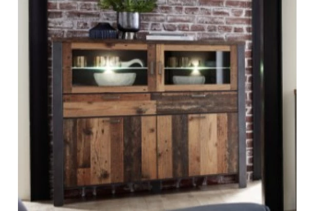 Komoda s vitrínou a s osvetlením z kolekcie Cardiff – exkluzívna optika v mestskom industriálnom štýle v kombinácii imitácia brúseného kovu s vintage optikou drevených dosiek. Ľahko si tak zariadite interier, ktorý bude nielen praktický, ale aj zaujímavý na pohľad.