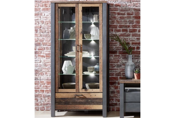 Široká vitrína s osvetlením z kolekcie Cardiff – exkluzívna optika v mestskom industriálnom štýle v kombinácii imitácia brúseného kovu s vintage optikou drevených dosiek. Ľahko si tak zariadite interier, ktorý bude nielen praktický, ale aj zaujímavý na pohľad.