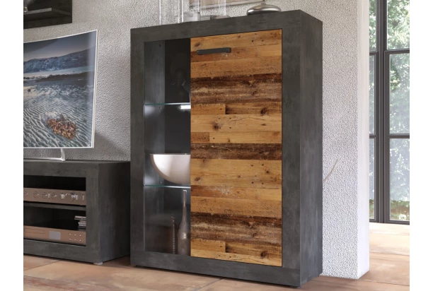 Nízka vitrínová skrinka z programu Kassel vo vintage optike drevených lát a obrúseného kovu. S týmto nábytkom si tak ľahko môžete zariadiť byt ladený do vintage alebo industriálneho štýlu. Skrinku môžete využiť samostatne alebo spolu s ďalšími elementmi z tohto produktového radu.