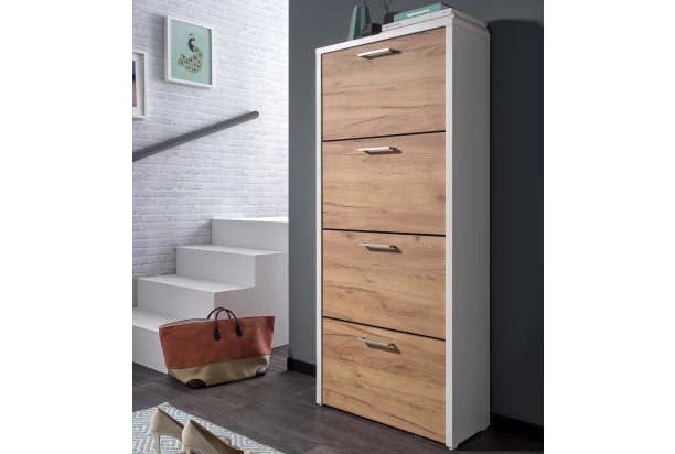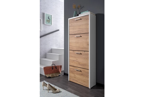 Moderný botník s výškou 152 cm ponúka 4 výklopné dvere s priehradkami na topánky. Široký rám botníku v bielej farbe dopĺňa medový dubový dekor na predných plochách.