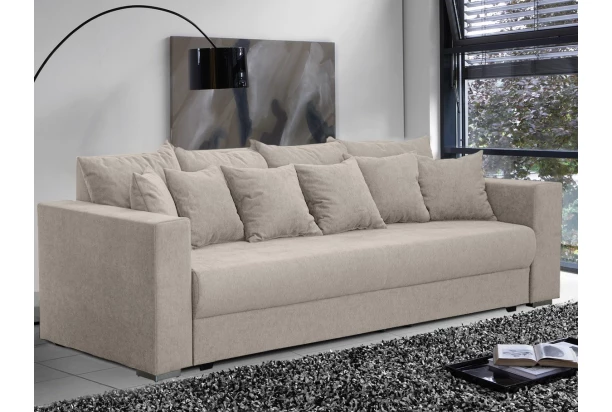 Priestranná pohovka s množstvom oporných vankúšov, vďaka ktorým si prispôsobíte pohodlie podľa potreby. Pohovka je očalúnená látkou v odtieni béžová. Vybavená rozkladacou funkciou na lôžko, ktoré je možné využiť aj na trvalé spanie. Veľkú ležaciu plochu 160×200 cm dopĺňa komfortný penový topper, ktorý ľahko uschováte do objemného úložného priestoru pod sedákom.