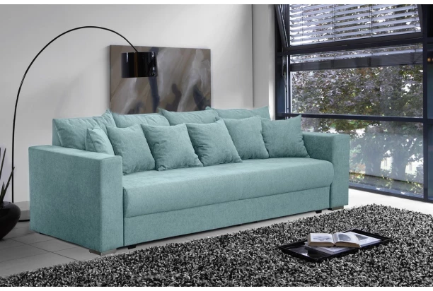 Priestranná pohovka s množstvom oporných vankúšov, vďaka ktorým si prispôsobíte pohodlie podľa potreby. Pohovka je očalúnená látkou v odtieni modrá aqua. Vybavená rozkladacou funkciou na lôžko, ktoré je možné využiť aj na trvalé spanie. Veľkú ležaciu plochu 160×200 cm dopĺňa komfortný penový topper, ktorý ľahko uschováte do objemného úložného priestoru pod sedákom.